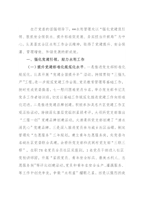 在厅党委的坚强领导下,**水利管理处以“强化党建促引领、狠抓安全保供水、提升标准促发展、务实担当开新局”为中心,认真落实全区水利工作会议精神,取得了党建提升、安全保灌、管理增效、和谐发展的新成效。一、强化党建引领,助力水利工作(一)提升党建标准化规范化水平。一是推进党支部标准