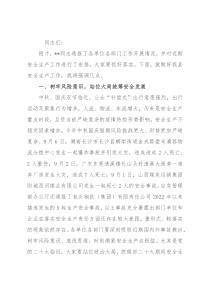 同志们:刚才,**同志通报了各单位各部门工作开展情况,并对近期安全生产工作进行了安排,大家要抓好落实。下面,就做好我县安全生产工作,我再强调几点。一、树牢风险意识,站位大局统筹安全发展中秋、国庆双节临近,公众“补偿式”出行意愿强烈,出行活动及聚集行为增多,人
