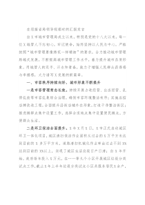 在迎接省局领导视察时的汇报发言自X市城市管理局成立以来,特别是党的十八大以来,每一位X城管人不忘初心,牢记使命,始终坚持以人民为中心,严格按照“城市管理要像绣花一样精细”的要求,全力推动城市管理跨越式发展,不断提高城市管理工作水平,着力提升城市品质形象。用城管人的双手、