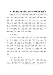 国企单位党组关于推进党建工作和公司管理融合的调研报告今年以来,公司以习近平新时代中国特色社会主义思想为指导,认真贯彻落实新时代党的建设总要求,深入推进基层党建整体提质增效,建立了组织体系设置科学、组织书记能