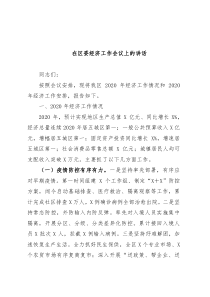 在区委经济工作会议上的讲话同志们:按照会议安排,现将我区2020年经济工作情况和2020年经济工作安排,报告如下。一、2020年经济工作情况2020年,预计实现地区生产总值X亿元、同比增长X%,经济总量连续2020年居五城区第一;一般公共预算收入X亿元,增