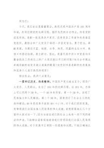 !借此机会,我讲六点意见:一要牢记历史、传承精神。中国共产党从诞生至今,领导广大党员、人民群众,走过了101年的光辉历程。这101年,总体上可以用两个30年,一个40年来形容。第一个30年,实现了民族独立和人