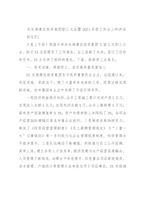 在交通建设投资集团职工大会暨2021年度工作会上的讲话同志们:大家上午好!很高兴参加交通建设投资集团X届X次职工大会。刚才XX总经理作了工作报告,会上表彰了先进,签订了目标责任书,XX主任讲了很好的意见。下面,我再讲三点意见:一、肯定成绩,乘势而上,坚定高质量发展信心XX交通建设投资集