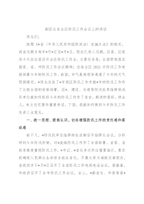 副区长在全区防汛工作会议上的讲话同志们:按照《*省〈中华人民共和国防洪法〉实施办法》的规定,我省汛期为每年*月*日至*月*日。现在已进入汛期,区委、区政府今天在这里召开全区防汛工作会,主要任务是:全面贯彻落实国家、省、市防汛工作会议精神;