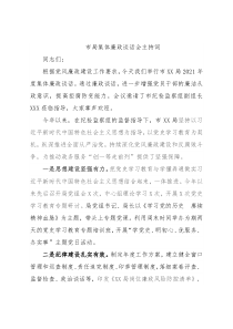 市局集体廉政谈话会主持词同志们:根据党风廉政建设工作要求,今天我们举行市XX局2021年度集体廉政谈话。通过廉政谈话,进一步增强党员干部的廉洁从政意识,提高拒腐防变能力。会议邀请了市纪检监察组副组长XX