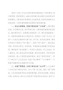 党的十九届六中全会对新时期党的建设提出了新的要求,面对新形势,落实新要求,**县全面加强以政治建设为统领的各项党的建设,不断把组织资源转化为发展资源,把组织优势转化为发展优势,以高质量党建推动县域经济高质量发展。一、突出立根铸魂,把稳不断前进的“方向盘”。强