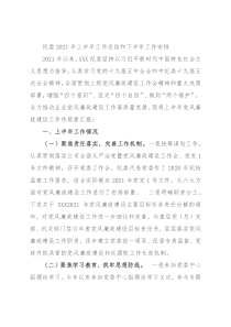 纪委2021年上半年工作总结和下半年工作安排2021年以来,XXX纪委坚持以习近平新时代中国特色社会主义思想为指导,认真学习党的十九届五中全会和中纪委十九届五次全会精神,全面贯彻上级党风廉政建设工作会精神和重大决策部署,增强“四个意识”、坚定“四个自信”、做到“两个维护