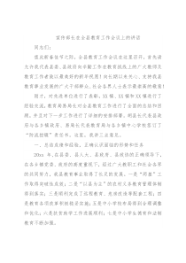 宣传部长在全县教育工作会议上的讲话同志们:值此新春佳节之际,全县教育工作会议在这里召开,首先请允许我代表县委、县政府向辛勤工作在教育战线上的广大教师及教育工作者致以最美好的新年祝愿!向长期以来关心、支持我县教育事业发展的广大干部群众、社会各界人士