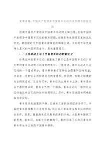 党课讲稿:中国共产党领导中国青年运动历史回顾及经验总结回顾中国共产党领导中国青年运动的光辉历程,总结中国共产党领导中国青年运动的基本经验,对继承和发扬我们党的优良传统,激励新时代中国青年继续创造辉煌业绩,为实现中华民族伟大复兴的中国梦而奋