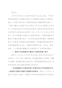 同志们:习近平总书记在十九届中央纪委六次全会上指出:“领导干部特别是高级干部要带头落实关于加强新时代廉洁文化建设的意见,从思想上固本培元,提高党性觉悟,增强拒腐防变能力。”“新时代廉洁文化建设”首次出现在习近平总书记重要公开讲话中,这为推进