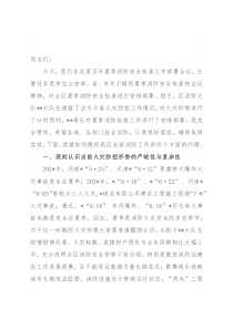 群众生命财产安全,事关社会大局和谐稳定。夏季消防安全检查工作任务已经明确,关键在于抓好贯彻落实。让我们在区委、区政府的正确领导下,振奋精神,迎接挑战,积极作为,真抓实干,不断开创消防工作新局面,为建设富裕文明和谐美丽新平安做出新的更大的贡献。谢谢大家!