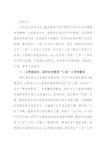 作进行了安排,大家要认真抓好落实;会上还印发了我市“三农”工作有关文件讨论稿,大家要认真研究,共同把文件修改好、落实好。下面,再讲几点意见:一、以更高站位,坚定扛牢做好“三农”工作的重任我们党自成立以来