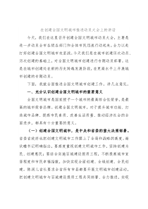础上,对全国文明城市创建进行专题动员部署,这是在城市创建处在新的历史跨越发展阶段,在更高水平上开展城市创建的专题动员。下面,我就全面推进全国文明城市创建工作,讲几点意见。一、充分认识创建全国文明城市的重要意义全国文明城市是国家授予一个城市的最高综合性荣誉,是最高的城市荣誉品牌。创建全国文明城市,