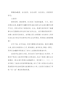 尊敬的*教授、各位委员、各位老师、各位家长,亲爱的同学们:大家好!夏树苍翠,燕语莺啼,*又迎来了收获的盛夏。今天,我们欢聚在这里,隆重举行*翻译学院2022届学生毕业典礼暨学位授予仪式,共同分享这个喜悦时刻。在此,我谨代表学校和丁晶董事长向已圆满完成学业的