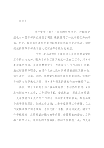 同志们:刚才宣布了局班子成员的任免决定,近期局党组也对中层干部岗位进行了调整,选拔任用了一批年轻优秀的干部,在此,我向即将离任的老领导和老同志表示衷心感谢,向新提拔的领导干部表示衷心祝贺并寄予殷切的希望。首先,要感谢原班子成员这么多年来对局党组工作的大力支持。张局自参加工作以来就一直在X工作,对