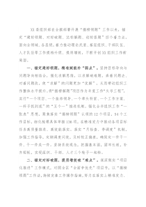件成一件。坚持系统观念,把握基本面,固牢长板,补齐短板,实现组织、干部、人才三个轮子一起转。二、锚定对标破题,提质增效破“难点”。谋深做实“项目化推进”工作模式,对照全区“全面争优先”项目书,以“揭榜领题”工作法,持续完善工作操作指南,努力在落实上精准发力、落地见效。围绕打造“
