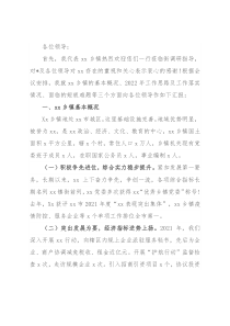 各位领导:首先,我代表xx乡镇热烈欢迎您们一行莅临街调研指导,对*及各位领导对xx存在的重视和关心表示衷心的感谢!根据会议安排,我就xx乡镇的基本概况、2022年工作思路及工作落实情况、面临的短板难题等三个方面向各位领导作如下汇报:一、xx乡镇基本概况Xx乡镇地处x