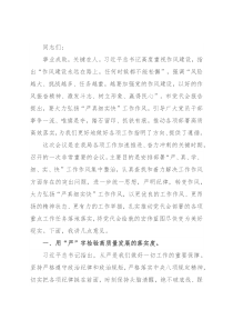 将党代会绘就的宏伟蓝图尽快变为美好现实。下面,我讲几点意见。一、用“严”字检验高质量发展的落实度。习近平总书记指出,从严是我们做好一切工作的重要保障。坚持严格遵守政治纪律和政治规矩,严格落实中央八项规定精神,切实把各项纪律挺在前面,时刻保持头脑清醒,绝不破底