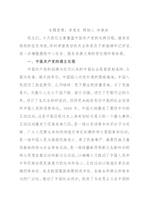 专题党课:学党史明初心知使命同志们,今天我们主要重温中国共产党的光辉历程,继承发扬党的优良传统,同时希望政协机关全体党员干部能够牢记宗旨,进一步增强围绕中心任务、服务发展大局的责任感和使命感。一、中国共