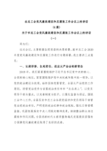 在总工会党风廉政建设和反腐败工作会议上的讲话(4篇)关于市总工会党风廉政建设和反腐败工作会议上的讲话(一)同志们:这次会议,主要根据各级党委的决策部署,就市总工会2020年度党风廉政建设和反腐败工作进行专题部署。我主要讲三点意见:一、认清形势、扛起责任,适应从严治会的新常态2019年,我们紧紧围绕