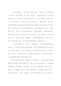 李大钊曾说:“青年者,国家之魂。”党的十九大报告指出“青年一代有理想、有本领、有担当,国家就有前途,民族就有希望。习近平总书记在庆祝中国共产主义青年团成立100周年大会上讲话指出“青年是社会中最有生气、最有闯劲、最少保守思想的群体,蕴含着改造客观世界、推动