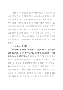 主要问题(一)带头深刻感悟“两个确立”的决定性意义,坚持党的创新理论“两个结合”的非凡历程,全面贯彻习近平新时代中国特色社会主义思想方面。始终坚持把学习习近平新时代中国特色社会主义思想作为首要政治任务,坚决拥护“两个确立”,牢固树立“四个意识”,不断增强“四个自信”,坚决做到“两个维