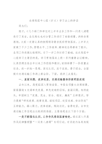 在局党组中心组(扩大)学习会上的讲话同志们:刚才,十几个部门和单位对上半年业务工作和一问责八清理进行了发言,各位局长也对分管工作进行了安排部署,讲的非常透彻,大家一定要认真的按照领导要求抓好贯彻落实。上半年大家做了不少工作,管理水平、工作效率、精神状态等都有了