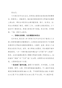同志们:今天我们召开这次会议,目的是全面落实省委省政府部署要求,乘势而上、再接再厉,推动城市建设提质和文明城市创建再上新台阶,带动全市经济社会高质量发展。刚才,XX同志、XX同志分别通报了情况、部署了工作,大家要认真抓好落实。3个县区作了