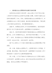 业管理标杆创建行动,公布了管理标杆企业、标杆项目和标杆模式(“三个标杆”)名单,促进国有企业不断强化管理体系和管理能力建设,与世界一流企业对标、加快向世界一流迈进。接下来,我将从六个方面介绍国有重点企业提高管理水平的背景。第一方面,提高