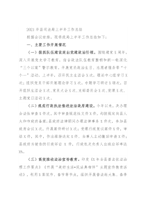 2021年县司法局上半年工作总结根据会议安排,现将我局上半年工作总结如下:一、主要工作开展情况(一)狠抓队伍建设突出党建政治引领。围绕建党X周年,深入开展党史学习教育,结合政法队伍教育整顿和新一轮深化“三个以案”警示教育