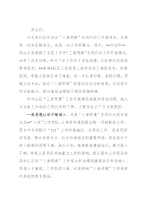 同志们:今天我们召开全区“三清两建”专项行动工作推进会,这既是一次加压推进会,也是一次工作部署会。刚才,**同志和**同志分别通报了全区上半年“三清两建”专项行动工作开展情况,分析了存在问题,并对下步工作作了具体部署,大家要切实抓好贯彻落实。**街道*社区工作组等三家单