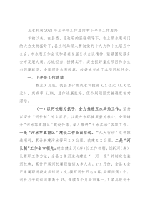 县水利局2021年上半年工作总结和下半年工作思路年初以来,在县委、县政府的坚强领导下,在上级水利部门的大力支持指导下,县水利局深入贯彻党的十九大和十九届五中全会、市水利工作会议和县委X届X次会议精神,紧紧围绕服务全市发展大局,忠诚担当,拼搏实干,突出抓好重点项目和水生态环境建设
