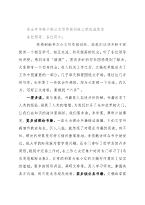 在全市年轻干部公文写作培训班上的交流发言各位领导、各位同仁:很感谢能举办公文写作培训班,给我们这些年轻干部提供一个相互学习、相互交流、共同提高的机会,听了各位领导的讲授,感到非常“解渴”,困扰多时的写作困惑得