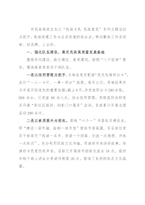 市民政局党总支以“民政为民民政爱民”系列主题活动为抓手,找准党建工作与业务发展的结合点,带动整体工作求突破、创品牌、上台阶。一、强化队伍建设,奠定民政高质量发展基础围绕作风建设、能力建设、素质建设,按照“八个坚持”要求,塑造高素质党员干部队伍。一是以信用管理为抓手。为每