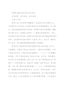 亲爱的2022届全体毕业生同学,各位老师,各位校友,各位来宾:大家上午好!俯仰之间,毕业的钟声就敲响了。俗话说:有仪式感的人生,才使我们有了存在感。毕业典礼是同学们在校园的最后一次大聚会,虽然当前疫情