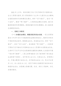 作风和纪律建设,深入推进党支部建设标准化。一、党建工作情况(一)加强政治建设,增强党组织政治功能。一是认真贯彻落实《中共中央关于加强党的政治建设的意见》,教育引导党员干部坚定政治信仰,提高政治站位,把准政