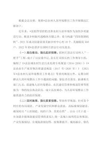 根据会议安排,现将*县农村人居环境整治工作开展情况汇报如下:近年来,*县始终坚持把改善农村人居环境作为加快乡村建设行动、推进乡村振兴战略的关键之举,着力构建“四项保障机制”,2021年成功创建省级美丽乡村中心村10个、美丽庭院560户,2
