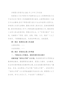 共青团大学委员会2021年上半年工作总结校团委以习近平新时代中国特色社会主义思想特别是习近平总书记关于青年工作的重要思想为指导,全面贯彻党的十九届五中全会精神,坚定不移落实团X届X中全会和省第X次团代会、学校第X次党代会精神,围绕为党育人根本任务,坚持党建带团建,紧