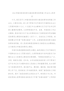 指引,找准找实专门协商机构与重要治理平台的结合点和切入点,切实发挥政协作为政治组织和民主形式的效能,通过开展“协商在基层”工作,推进政协协商向基层延伸发展,实现政协协商与基层协商有效衔接、同社会治理相结合,把人民政协的制度优势转化为