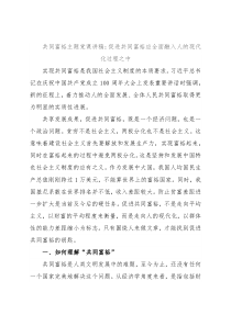 共同富裕主题党课讲稿:促进共同富裕应全面融入人的现代化过程之中实现共同富裕是我国社会主义制度的本质要求。习近平总书记在庆祝中国共产党成立100周年大会上发表重要讲话时强调,新的征程上,着力推动人的全面发展、全体人民共同富裕取得更为明显的实质性进展。共享发展成果,促进共同富裕,既是