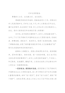 代市长供职报告尊敬的X主任、各位副主任、各位委员:感谢组织的信任和培养,我被选派到X工作,并提名为市人民政府副市长、代市长人选。今天,市人大常委会召开会议,履行法定程序,充分体现了市委、市人大和全市人民对我的关心。在此,我对大家的信任和支持表示衷心的感谢!近年来,在市委的