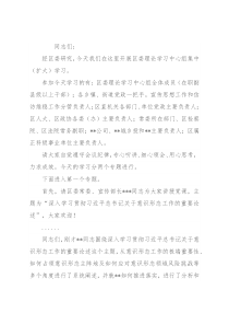 同志们:经区委研究,今天我们在这里开展区委理论学习中心组集中(扩大)学习。参加今天学习的有:区委理论学习中心组全体成员(在职副县级以上干部);各乡镇、街道党政一把手,宣传思想工作和信访维稳工作分管负责人;区直机关各部门、单位党政主要负责人;区人大、区政协各委(办)主要