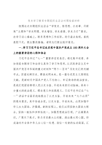 流。二是精选自选动作,突出特色亮点。创新学习方法,把党史学习教育与读书活动结合起来,线上线下相贯通,读书学史相促进。联合XXX、XXX,开展集体学习,聆听专题党课,实现资源共享、共同交流提高。现场教学体悟,结合省内外调研考察,赴陕西省富平县习仲勋陵园爱国主义教育基地