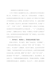 县委副书记任期思想工作总结×年×月担任×县委副书记以来,主要协助书记负责县委日常工作,负责联系人大、政协工作,负责信访稳定、乡村振兴、扶贫脱贫和群团组织等方面工作。坚持深入学习贯彻习近平新时代中国特色社会主义思想