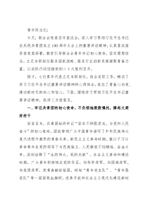精神,我讲三方面意见。一、牢记共青团的初心使命,不负领袖殷殷嘱托,撑起大梁好好干回首百年,共青团始终牢记“坚定不移跟党走,为党和人民奋斗”的初心使命,团结带领广大中国青年谱写了中华民族伟大复兴进程中激昂的青春乐章。新民主