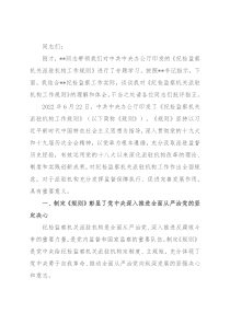 等。我们要在全面学习理解《规则》的基础上,准确把握《规则》的主旨要义。(一)坚持职责定位,把坚决做到“两个维护”作为根本政治责任。深化派驻机构改革的根本目的是坚持和加强党的全面领导,加强党中央集中统一领导,确保党的理论和路线方针政