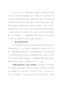今年以来,XX审计局始终把学习贯彻习近平新时代中国特色社会主义思想作为首要政治任务,严格执行《关于新形势下党内政治生活的若干准则》要求,坚持在学习贯彻、夯实举措、强化教育等方面全面发力,通过实施一系列有力举措,推动