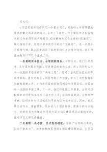 同志们:x项目是我市引进的又一个重点项目,对推动x市高质量发展具有重大而深远的意义。全市上下要把x项目建设作为检验相关部门和党员干部大局意识、担当精神和工作实绩的“试金石”,作为锤炼干部、发现干部和使用干部的“竞技场”,进一步提升干部精气