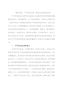 要、最根本、最关键的约束性规范,它是管方向、路线和全局的,必须坚决执行。党员干部必须站在从严治党、巩固党的执政基础和执政地位的高度,深刻认识严守政纪律和政治规矩的重要性,将其作为首要的纪律遵守。一、严守政治纪律的意义毛泽东同志曾说:“加强纪律性,革命无不胜”。这是无产