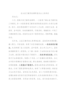 在全县卫健系统调研座谈会上的讲话同志们:今天,很高兴到卫健系统调研,一方面是了解全县卫健系统工作情况,另一方面是看看卫健系统贯彻落实县第X次党代会情况。刚才,我们现场调研了东双沟中心卫生院、洪渠卫生室、县医院、县中医院、妇幼保健院等,印象深刻,感触很多;听取了卫健委情况汇报,其他同